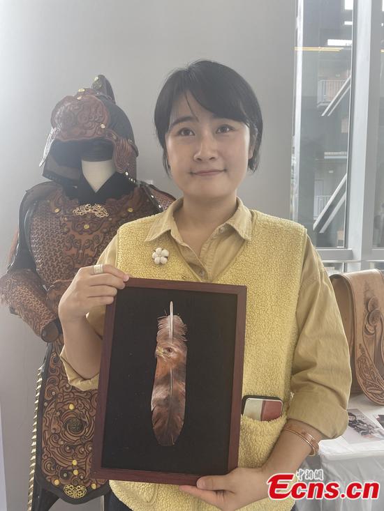 Meng Lulu shares with Ecns one of her leather carving work after the sharing session of “Xinjiang Through the Eyes of Locals”is held in Beijing on November 16, 2023. (Photo: Ecns.cn/Xue Lingqiao)