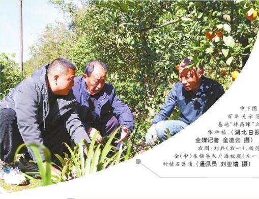 中下图:百年关示范基地“林药蜂”立体种植。(湖北日报全媒记者 金凌云 摄) 右图:刘兵(右一)、杨德金(中)在指导农户潘祖现(左一)种植石菖蒲。(通讯员 刘亚靖 摄)