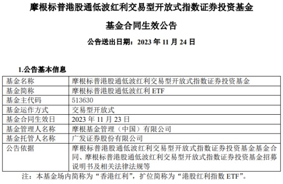 中国经济网北京11月24日讯 今日,摩根基金管理(中国)有限公司发布摩根标普港股通低波红利交易型开放式指数证券投资基金基金合同生效公告。