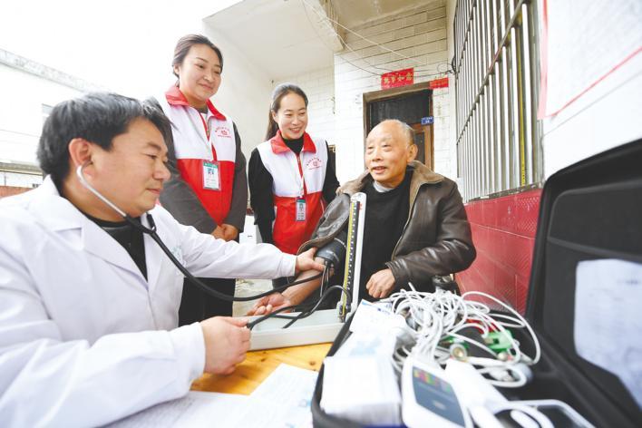 11月15日,老河口市袁冲乡李文成村,家庭医生李晶晶手提医药箱,来到72岁的村民王秀容家,为她进行健康检查。