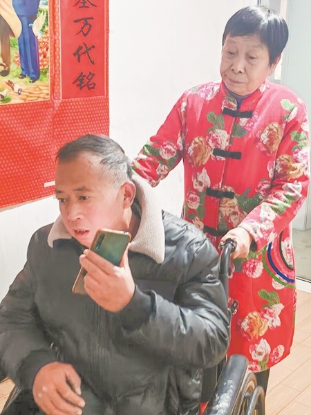 胡桂香照顾坐在轮椅上的何祥伢 通讯员供图