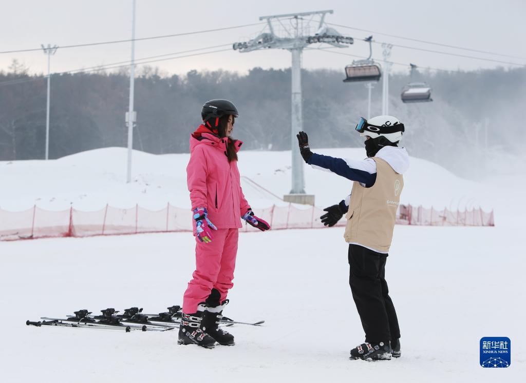 11月26日,滑雪教练在沈阳市东北亚滑雪场内指导一名滑雪爱好者。新华社记者 陈为 摄