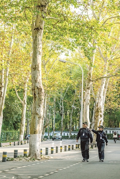 此时,道路两侧高大的梧桐树树叶开始变黄,一阵风吹过,片片飘落,“前几天刮大风,这条路一天清了近50袋树叶。”正在路上巡查的保洁班长周克红师傅说。