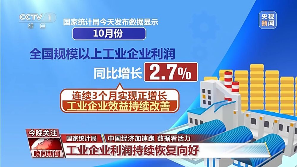 国家统计局27日发布数据显示,10月份,全国规模以上工业企业利润同比增长2.7%,连续3个月实现正增长,工业企业效益持续改善。10月份,工业生产稳定增长,产品销售率连续4个月保持在97.0%以上,带动企业营收持续改善。其中,规上工业企业营业收入同比增长2.5%,增速较9月份加快1.3个百分点,连续4个月回升。
