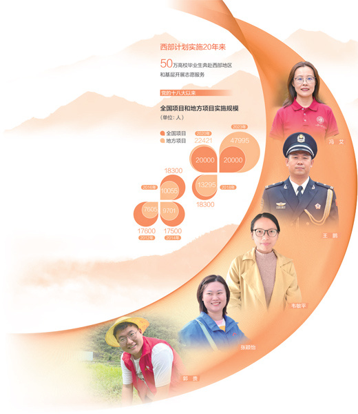 20年来,西部计划共选拔派遣超过50万名高校毕业生到西部地区,开展脱贫攻坚、乡村教育、民族团结、基层治理等方面的志愿服务,以响亮的青春之歌,谱写中国青年志愿者行动的奋进篇章。