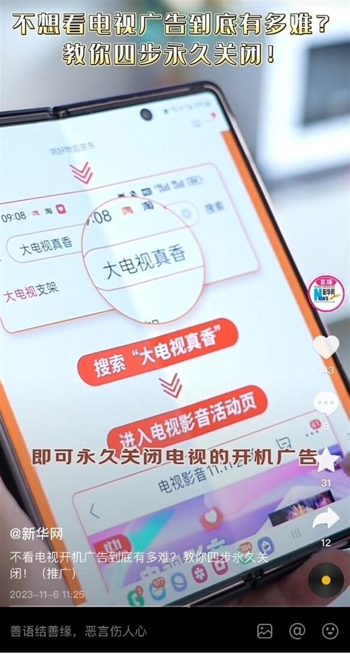 由于开机广告是部分智能电视生产企业的利润来源,成了强行植入的“标配”,要想取消还难,有商家推出“教您4步永久关闭电视开机广告”的攻略,看起来是提供了“解方”,可这四步对老年人来说,要掌握也不容易。老年人用户只想开机就是节目,就这么简单的事,为何要搞得那么复杂。由于用户苦开机广告久矣,为回应“看电视难,看电视烦”的社会关切,今年8月起,国家广播电视总局联合工业和信息化部、国家市场监督管理总局等有关单位,就电视“套娃”收费和操作复杂等问题进行专项整治。从11月开始到明年年底,治理工作后续阶段已经开始,将在全国范围继续推广。