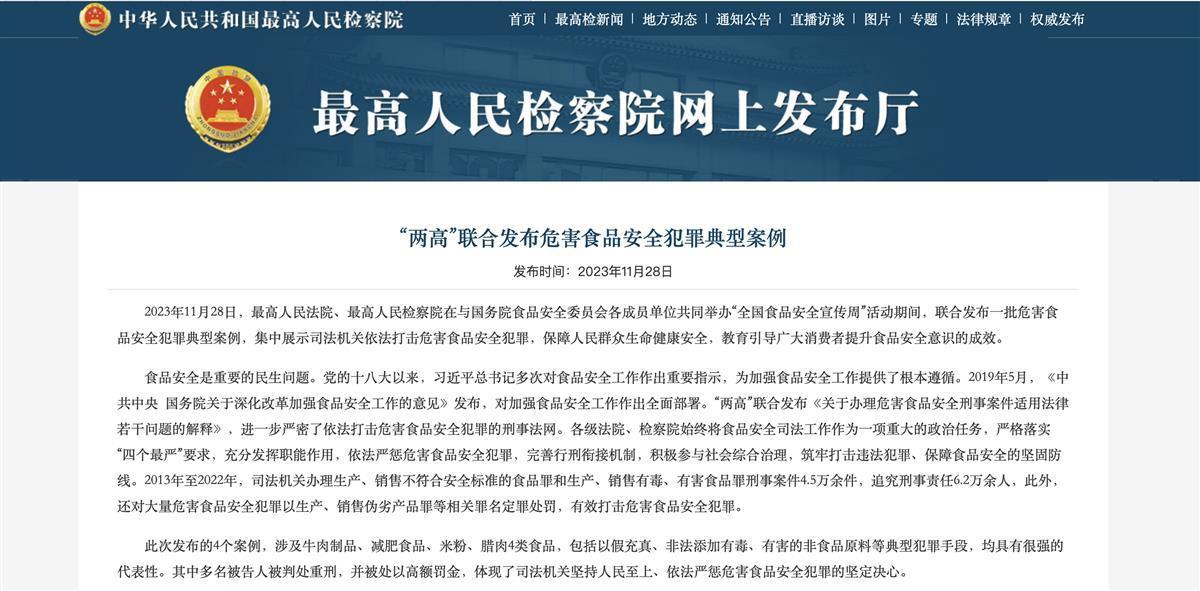 据了解,此次发布的4个案例,涉及牛肉制品、减肥食品、米粉、腊肉4类食品,包括以假充真、非法添加有毒、有害的非食品原料等典型犯罪手段,均具有很强的代表性。其中多名被告人被判处重刑,并被处以高额罚金,体现了司法机关坚持人民至上、依法严惩危害食品安全犯罪的坚定决心。