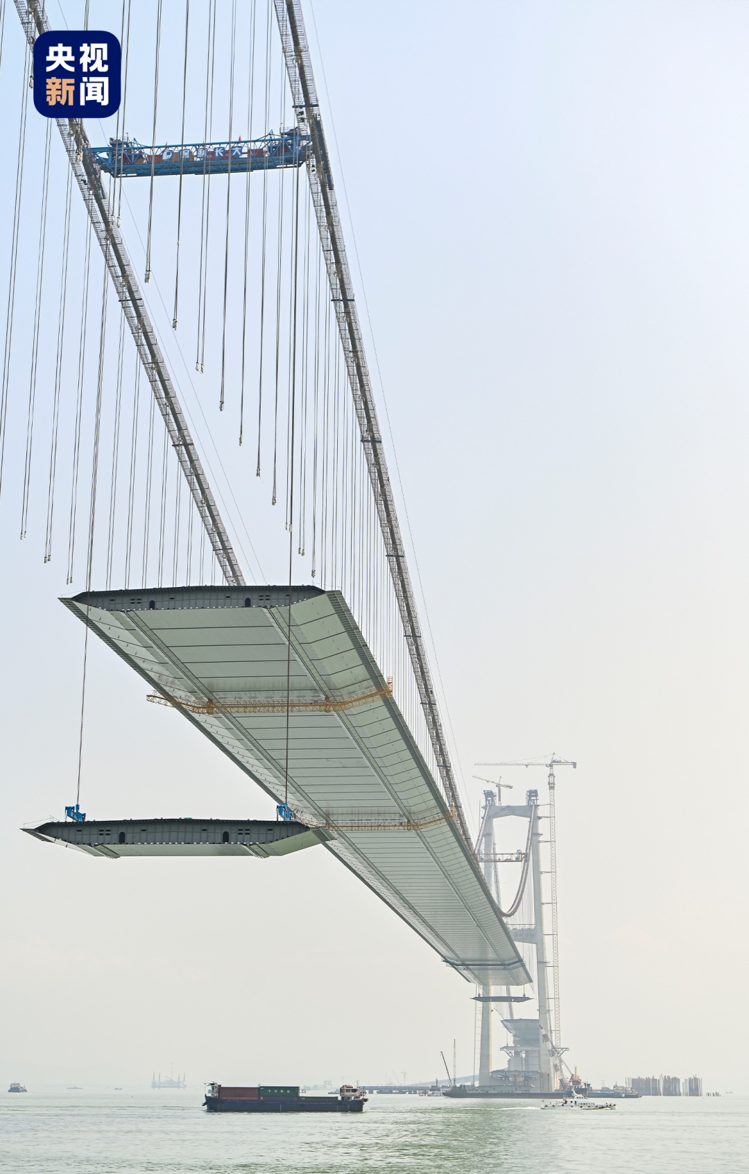 △今年3月,伶仃洋大桥钢箱梁吊装施工现场。