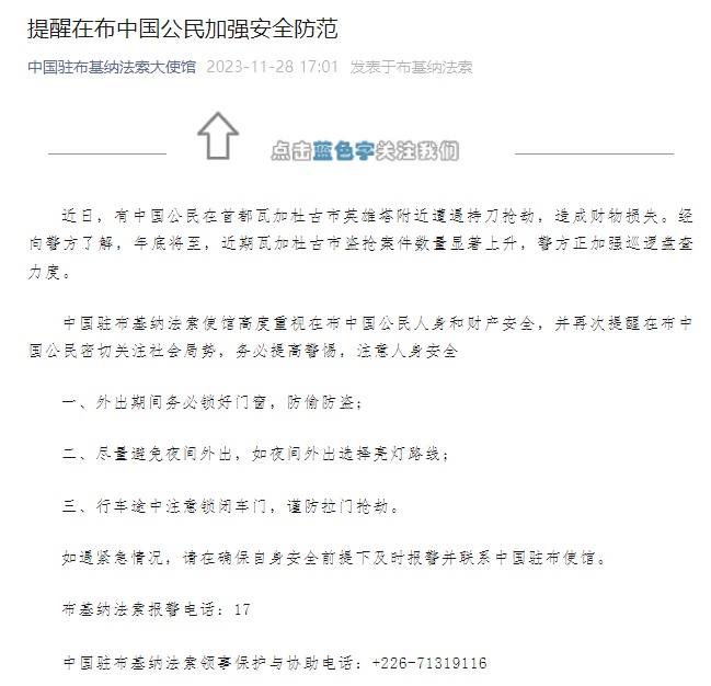 中国驻布基纳法索使馆高度重视在布中国公民人身和财产安全,并再次提醒在布中国公民密切关注社会局势,务必提高警惕,注意人身安全。