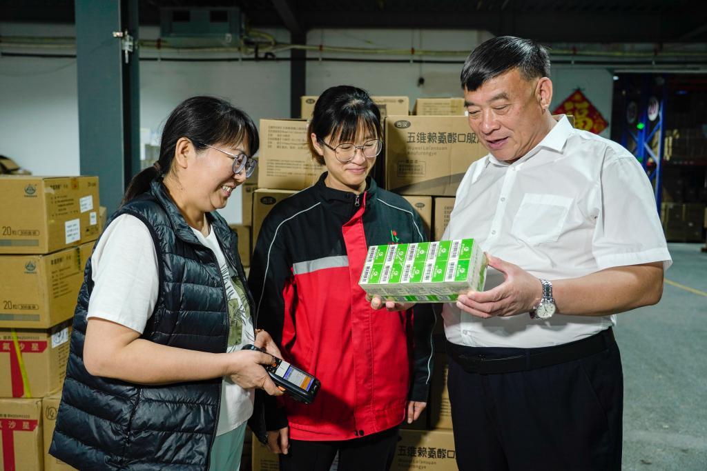 图为裴树清在安排公司员工送药。