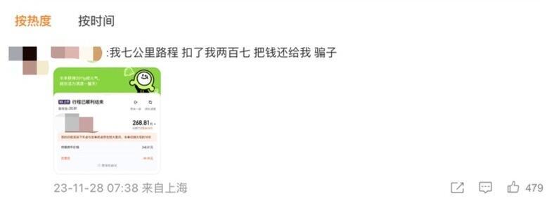 有已经完成打车的网友称,APP在行程完成后出现了扣费金额错误,一位网友表示自己7公里路程被扣了近270元,并贴出订单截图,还有网友称原本不到40元的打车费系统计费400多元。