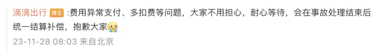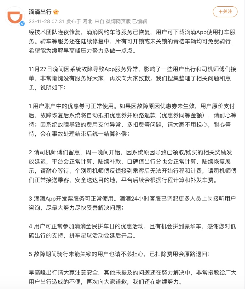 11月28日早上7点31分,@滴滴出行再次发文称,经技术团队连夜修复,滴滴网约车等服务已恢复,骑车等服务还在陆续修复中,所有可开锁或未关锁的青桔车辆均可免费骑行,并就广大网友及网约车司机关心的问题进行了回复。