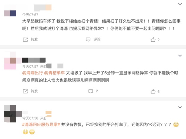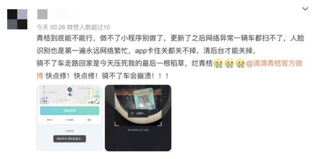 与此同时,网友在使用滴滴旗下的滴滴青桔共享单车业务时也遇到了类似崩溃问题,该崩溃影响一直持续到28日早间。