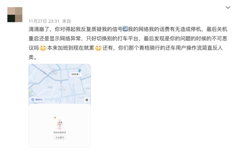 11月27日晚至28日,不少网友陆续在社交平台表示,使用滴滴出行呼叫网约车后,APP突然无法使用,页面显示网络加载异常,有的则无法定位,导致不能打车。