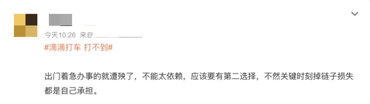 浙江在线记者注意到,此次滴滴系统崩溃问题引发了系列“连锁反应”。在社交平台,与“滴滴崩了”一起登上热搜的还有“滴滴打车 打不到”“部分滴滴司机开始提现”“滴滴系统崩溃其他平台爆单”等话题,不少经常使用滴滴打车通勤的网友表示“全勤没了”。这也让不少网友开始重新审视出行方式选择,有人呼吁,用户日常出行需要多一份选择。