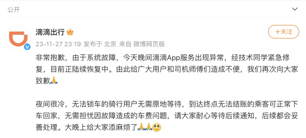 对此,11月27日夜间,滴滴出行官方微博道歉并回应称,由于系统故障,27日晚间滴滴App服务出现异常,技术人员正在紧急修复,无法锁车的骑行用户无需原地等待,到达终点无法结账的乘客可正常下车回家,无需担忧因故障造成的车费问题。