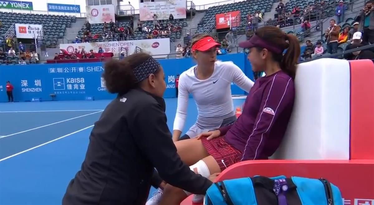 莎娃(中)安慰因伤退赛的王欣瑜(2019年比赛现场截屏)