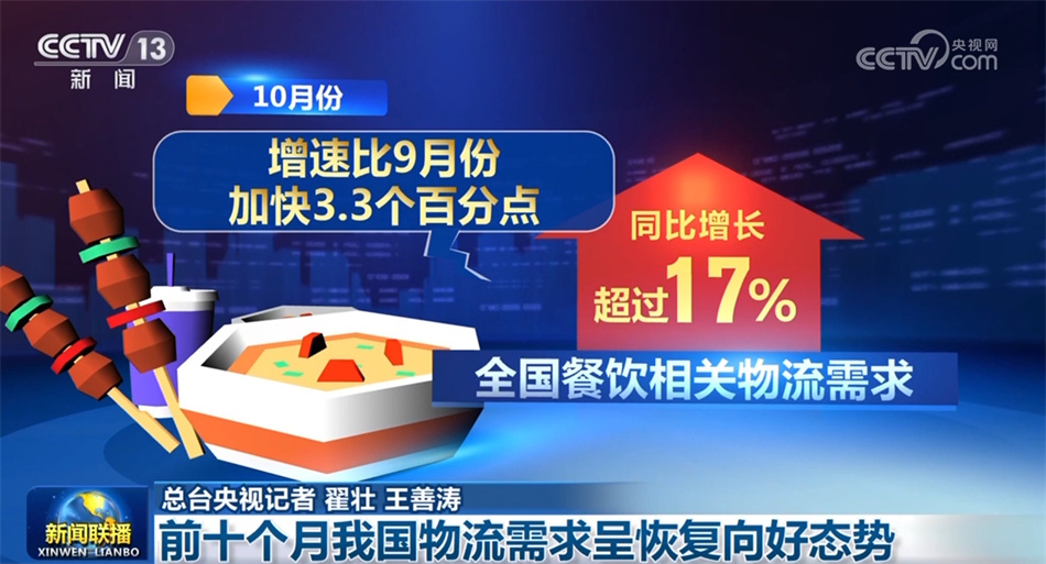 随着线下消费场景全面恢复,消费物流需求持续释放。10月份,全国餐饮相关物流需求同比增长超过17%,增速比9月份加快3.3个百分点。在直播带货等新业态带动下,相关的智能消费品物流需求同步扩大,1—10月份智能车载设备制造、智能无人飞行器制造物流需求增长超过50%。
