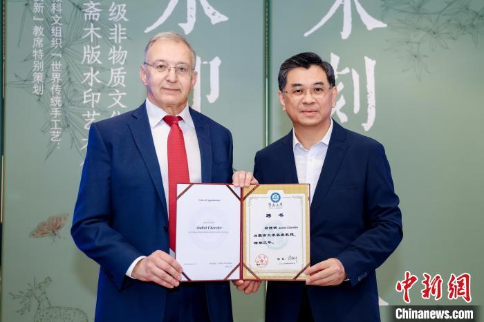 暨南大学党委书记林如鹏为安德烈·切韦寥夫(左一)颁发暨南大学客座教授证书。暨南大学 供图