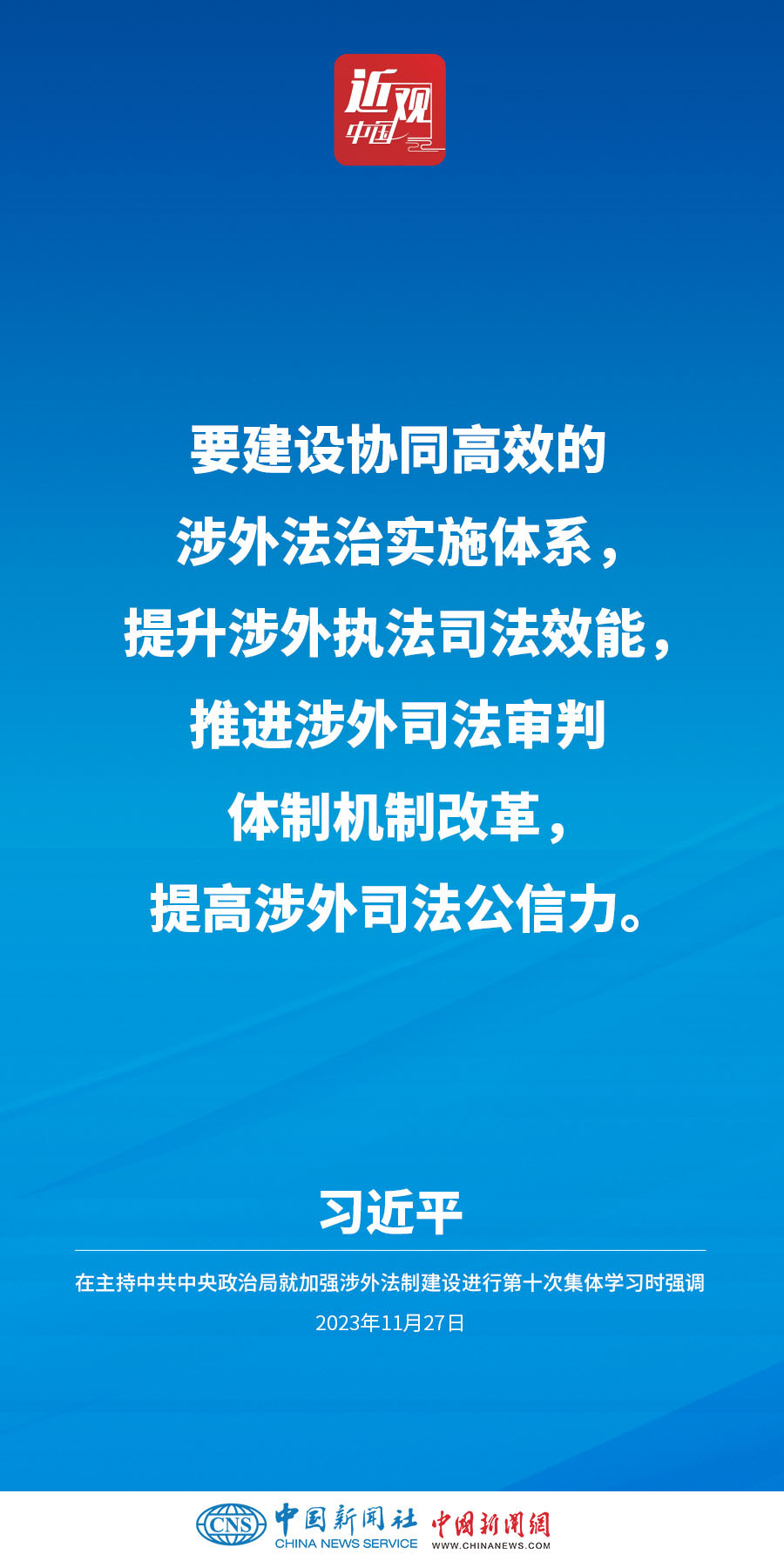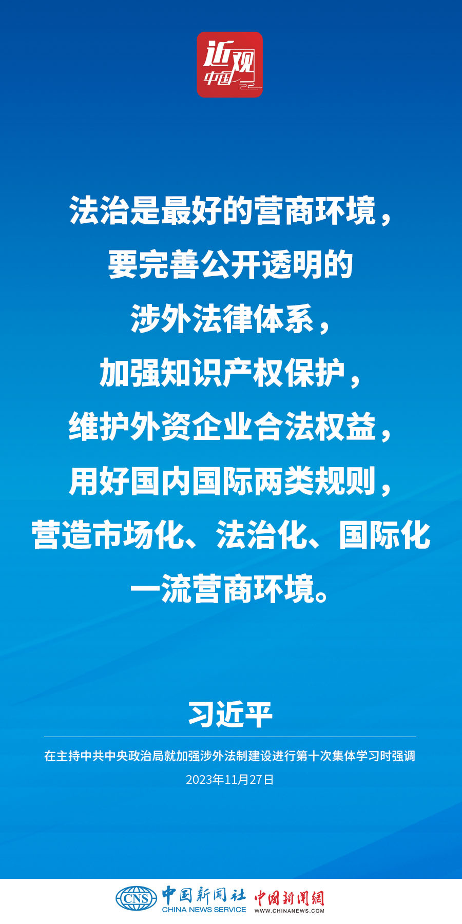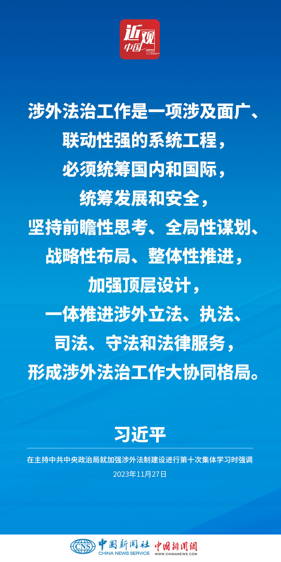 中共中央政治局11月27日下午就加强涉外法制建设进行第十次集体学习。中共中央总书记习近平在主持学习时强调,加强涉外法治建设既是以中国式现代化全面推进强国建设、民族复兴伟业的长远所需,也是推进高水平对外开放、应对外部风险挑战的当务之急。要从更好统筹国内国际两个大局、更好统筹发展和安全的高度,深刻认识做好涉外法治工作的重要性和紧迫性,建设同高质量发展、高水平开放要求相适应的涉外法治体系和能力,为中国式现代化行稳致远营造有利法治条件和外部环境。他指出——