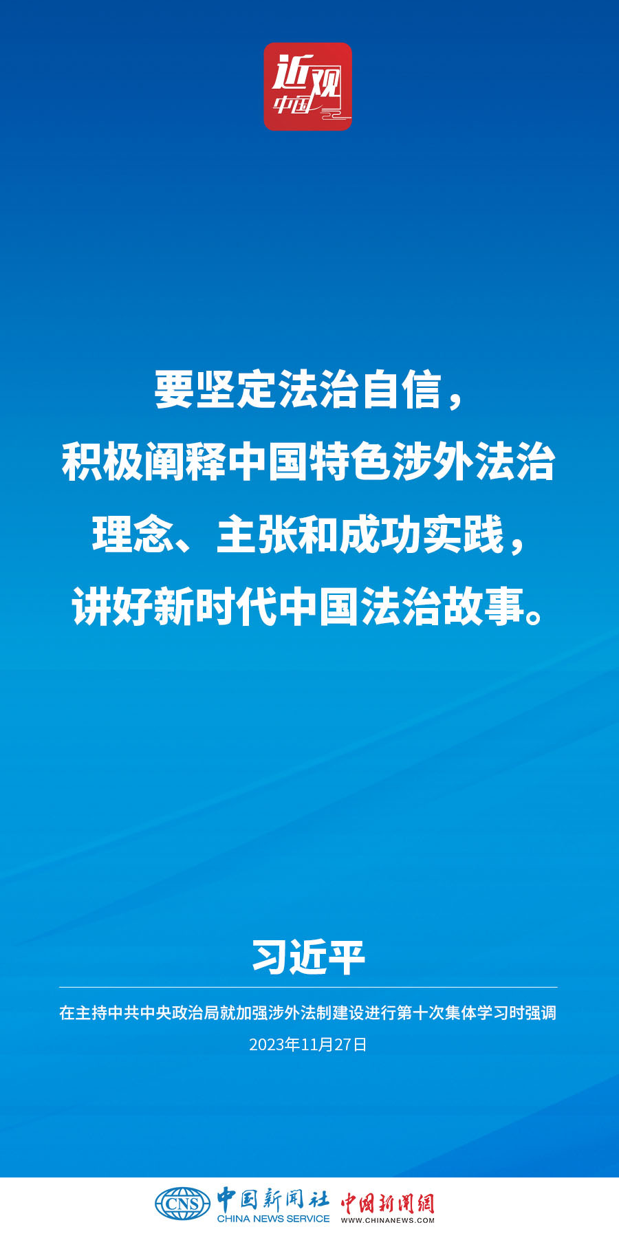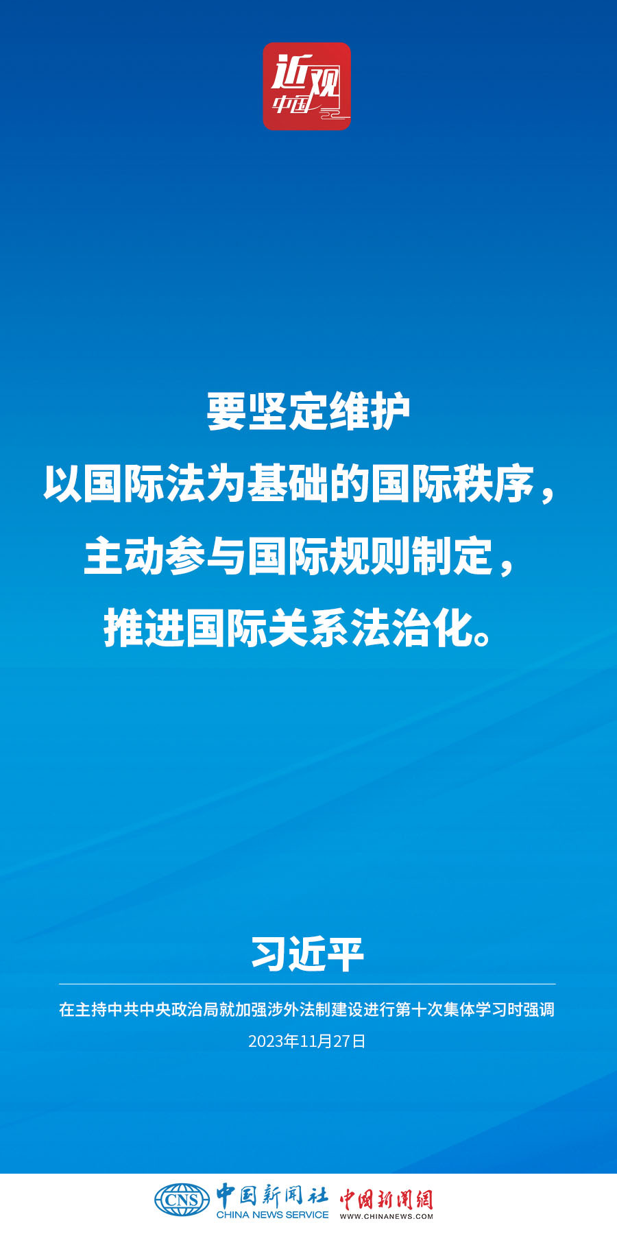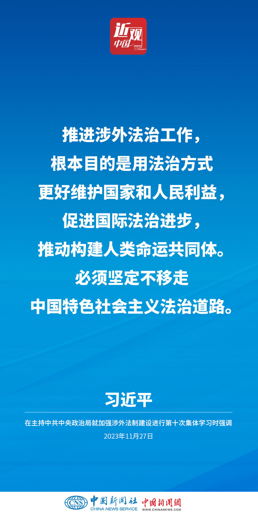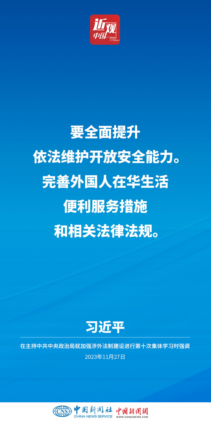 中共中央政治局11月27日下午就加强涉外法制建设进行第十次集体学习。中共中央总书记习近平在主持学习时强调,加强涉外法治建设既是以中国式现代化全面推进强国建设、民族复兴伟业的长远所需,也是推进高水平对外开放、应对外部风险挑战的当务之急。要从更好统筹国内国际两个大局、更好统筹发展和安全的高度,深刻认识做好涉外法治工作的重要性和紧迫性,建设同高质量发展、高水平开放要求相适应的涉外法治体系和能力,为中国式现代化行稳致远营造有利法治条件和外部环境。他指出——