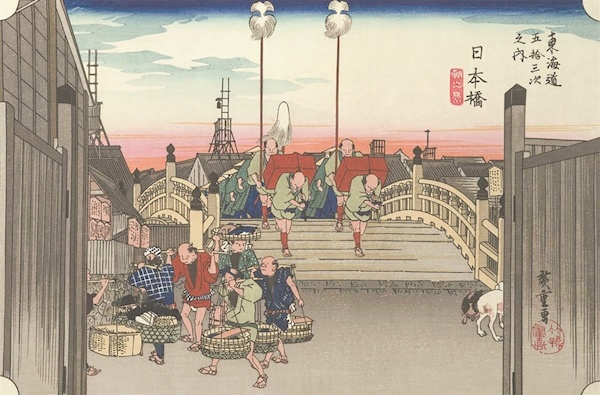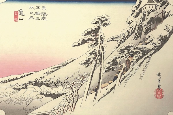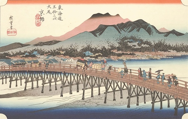 而《东海道五十三次》中的“五十三次”,是指江户与京都之间的53个宿场(即驿站)。近200年前,画师歌川广重沿着驿站一路行走,将目之所及的风土人情与自然景观都浓缩于笔下,凝固了那片时空下的春夏秋冬。