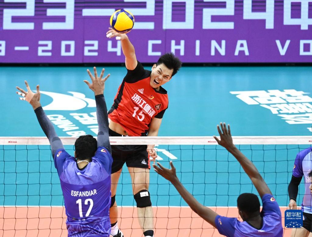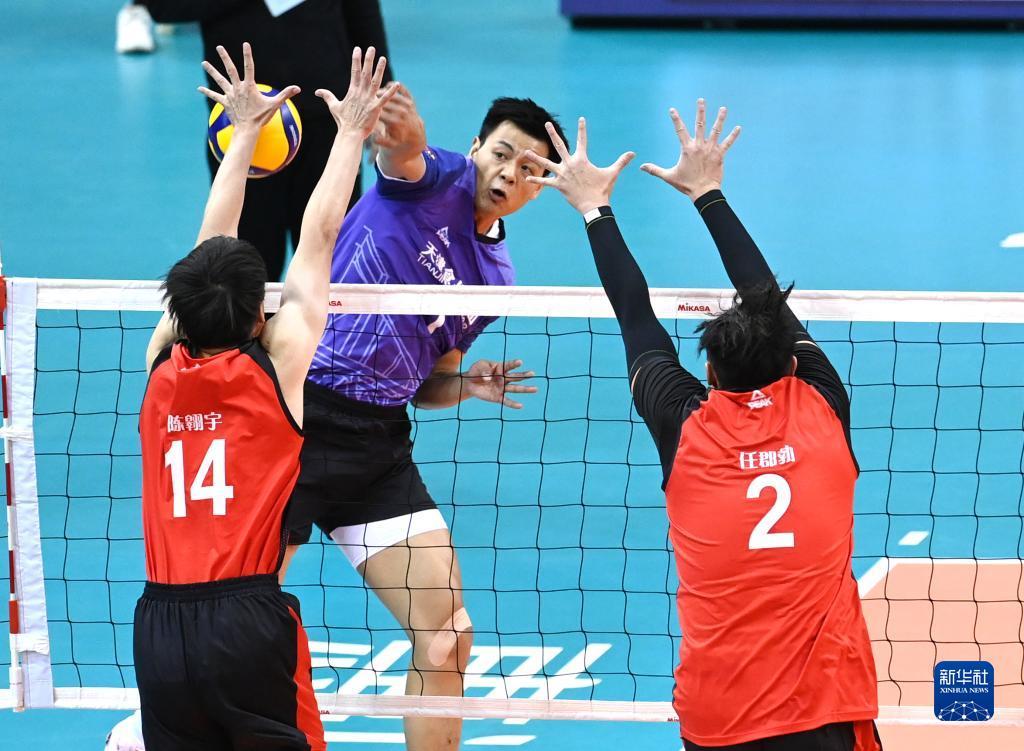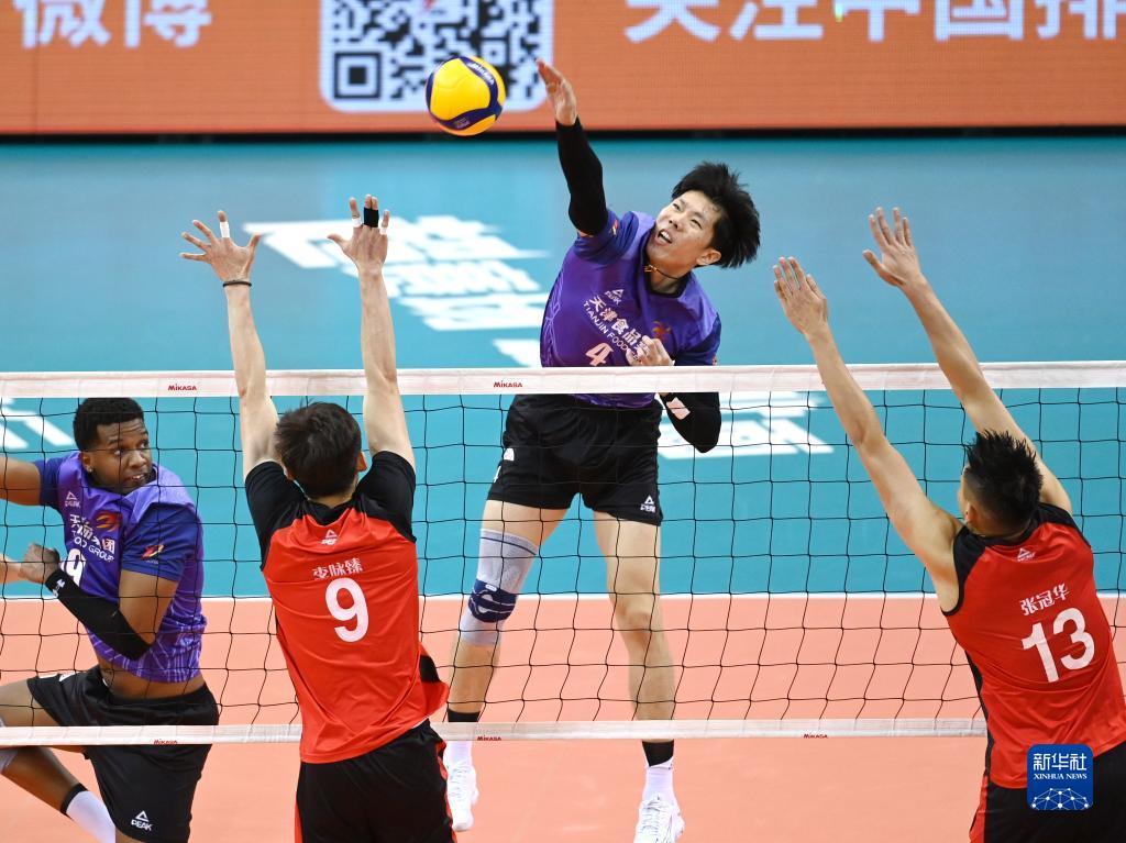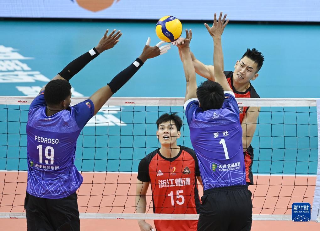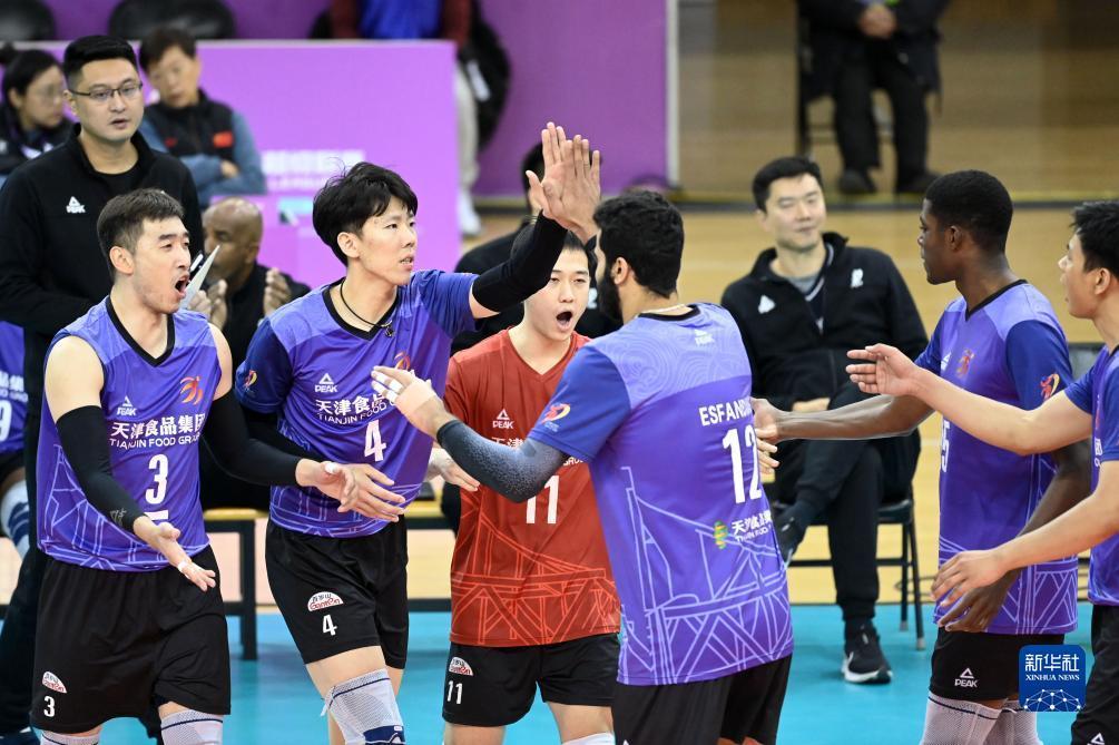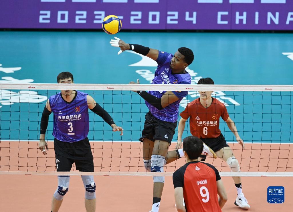 当日,在天津进行的2023-2024中国男子排球超级联赛B组小组赛中,天津食品集团队主场以3比2战胜浙江德清队。