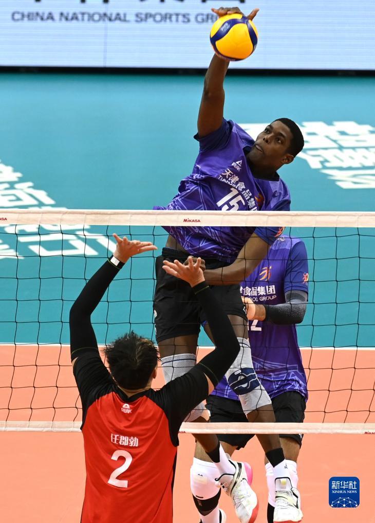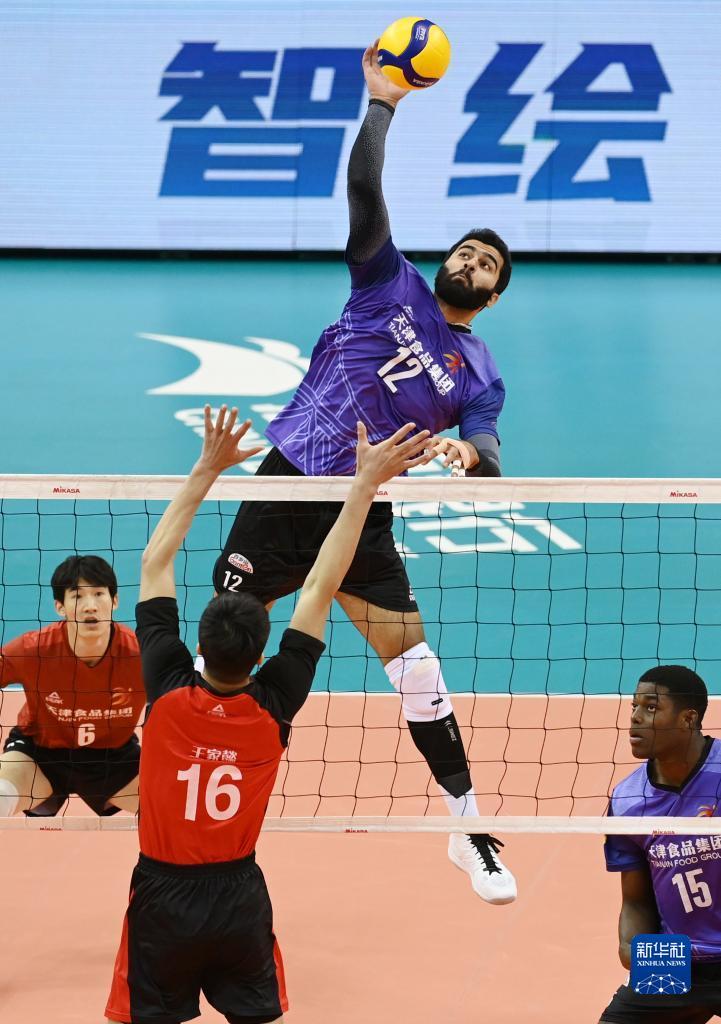 11月30日,天津食品集团队球员佩德罗索(左二)在比赛中扣球。新华社记者 赵子硕 摄
