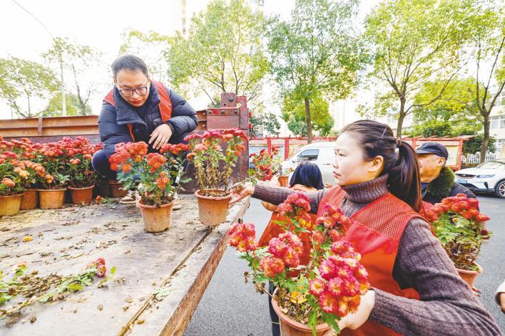12月1日,在武汉市东西湖区径河街黄狮海社区,志愿者将菊花送给社区居民。近日,历时近一个月的武汉市第40届金秋菊展正式闭展,全市18个展区将陆续撤展,各展区选取4万余盆品相较好的花,走进全市90个社区,并开展菊花科普、养菊课堂等活动,继续在初冬装点市民生活。 (湖北日报全媒记者 倪娜 通讯员 徐卉婷 摄)