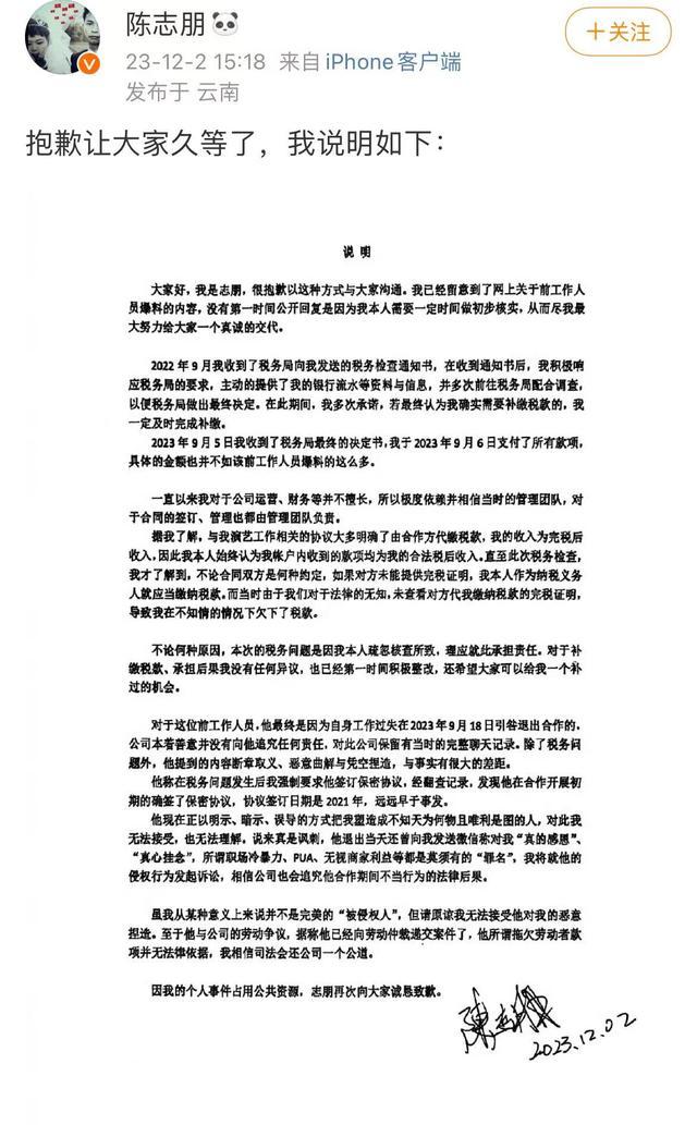 12月1日,陈志朋前员工@准老板王成功 曝陈志朋偷税漏税引发热议。