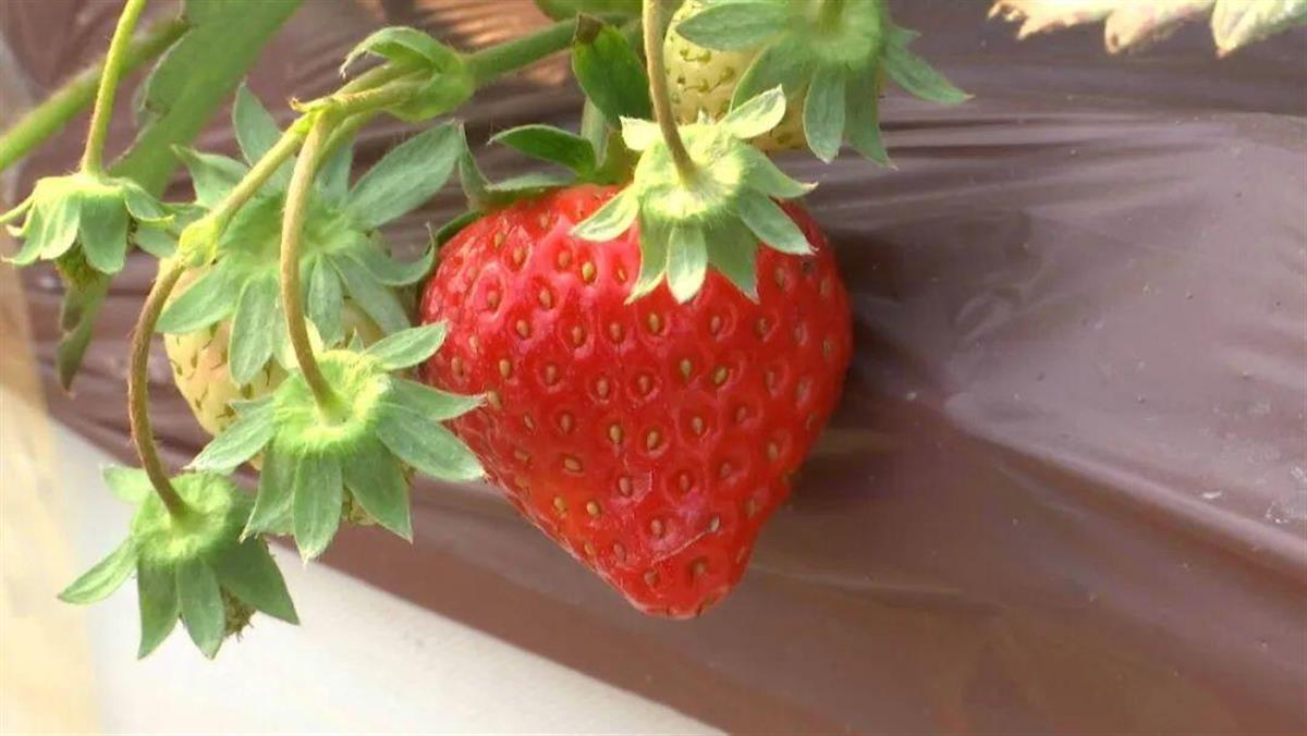 据介绍,该基地全部采用立体种植无土栽培新模式,直接将草莓栽种在由椰糠、草炭、珍珠岩等制成的混合基质中,只需打开设备阀门,搭在草莓苗根系附近的水管便会慢慢往下滴水,为草莓苗精准浇水、施肥,保证每棵草莓都吸收到均衡的水分和营养。