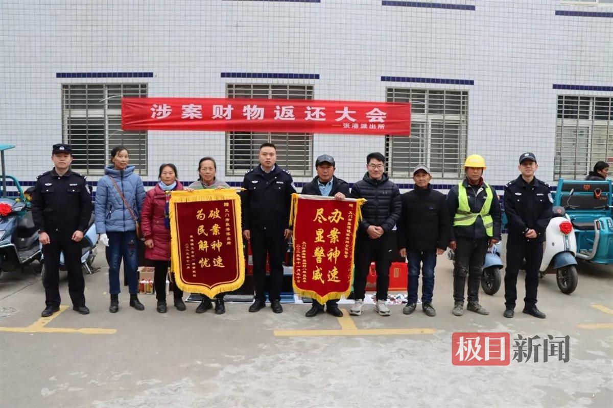 12月2日,极目新闻记者获悉,天门市公安局在张港派出所举行被盗财物集中发还仪式,民警将近期追回的价值10万余元的各类被盗财物全部归还失主,包括12辆摩托车、电动车,4台笔记本电脑、1部单反相机、40余瓶白酒、10余套古玩、手表等。发还仪式上,民警给即将返还的被盗车辆戴上了大红花。