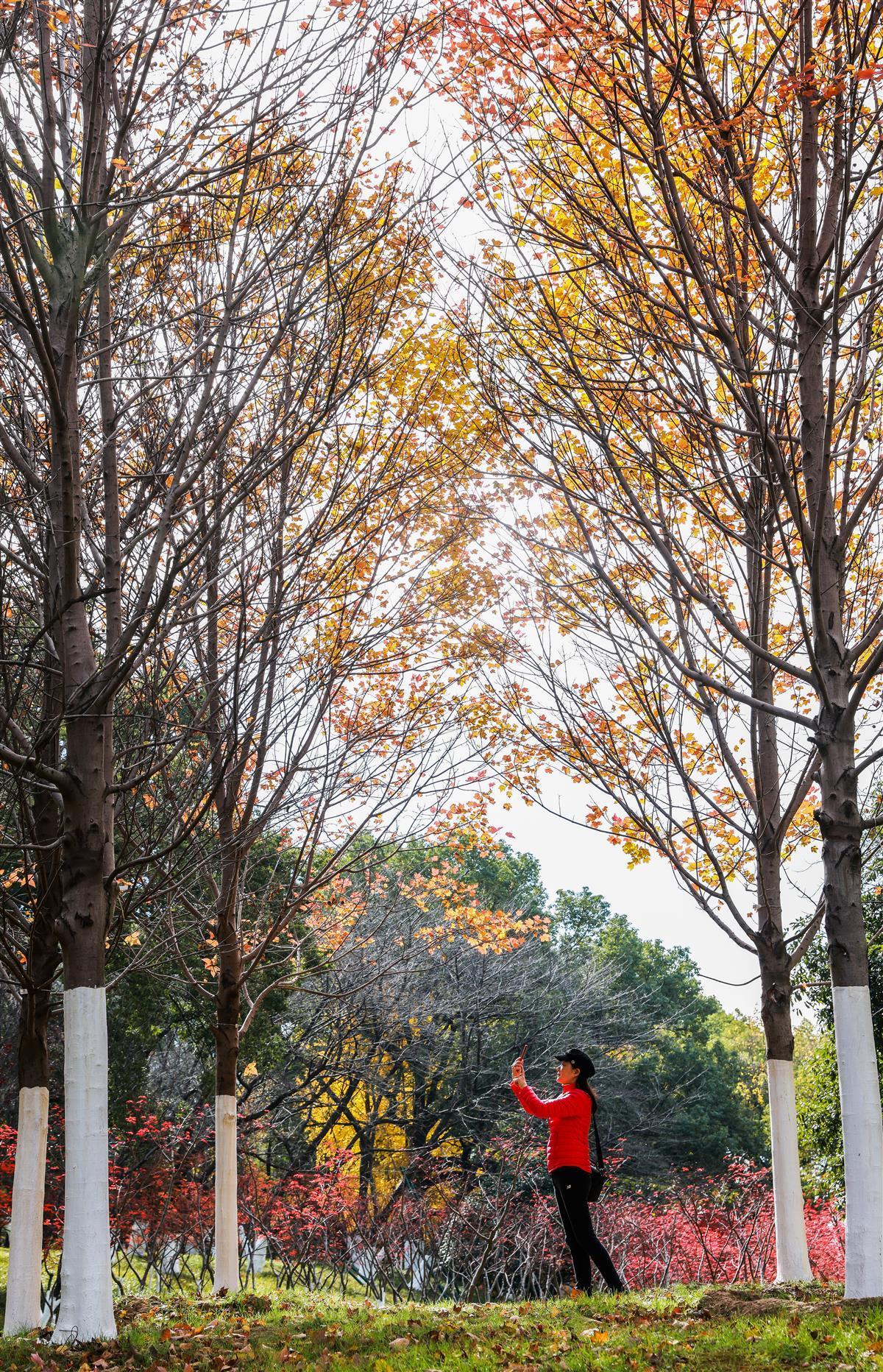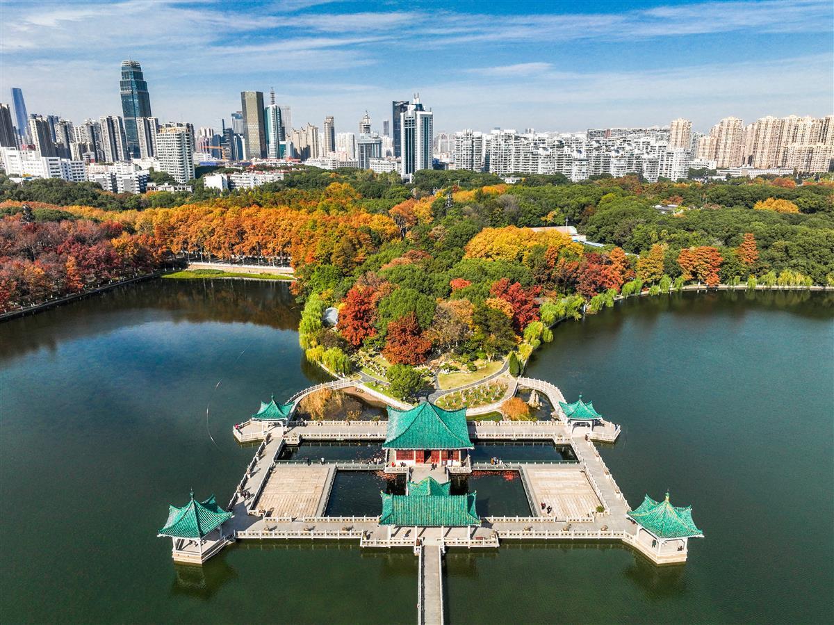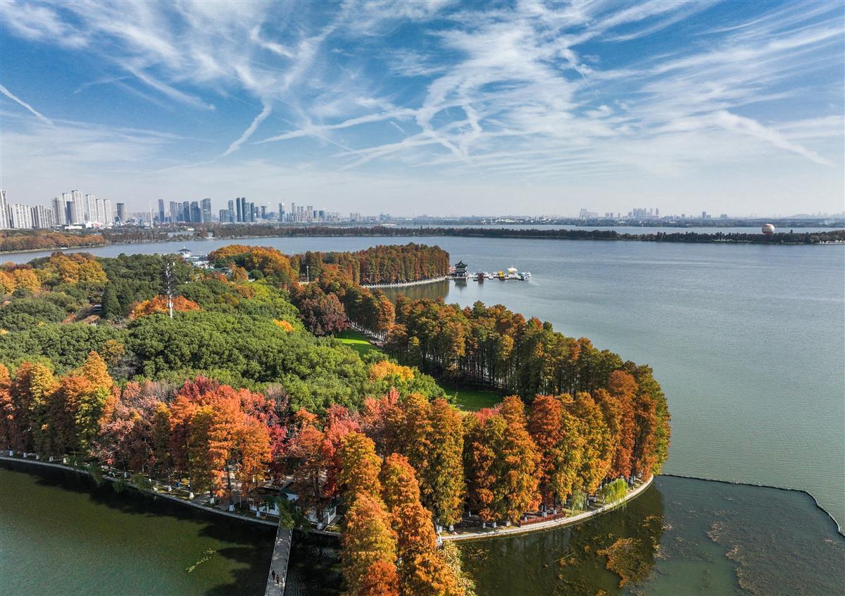 初冬的武汉一连数日晴空万里,东湖湖畔的红枫、银杏等树木五彩斑斓,从深红到金黄,从浅黄到艳红,各种色彩层层叠叠,相映成景。从空中俯瞰,东湖景区美成了一幅油彩画,让人顿生“舟行碧波上,人在画中游”的感觉。