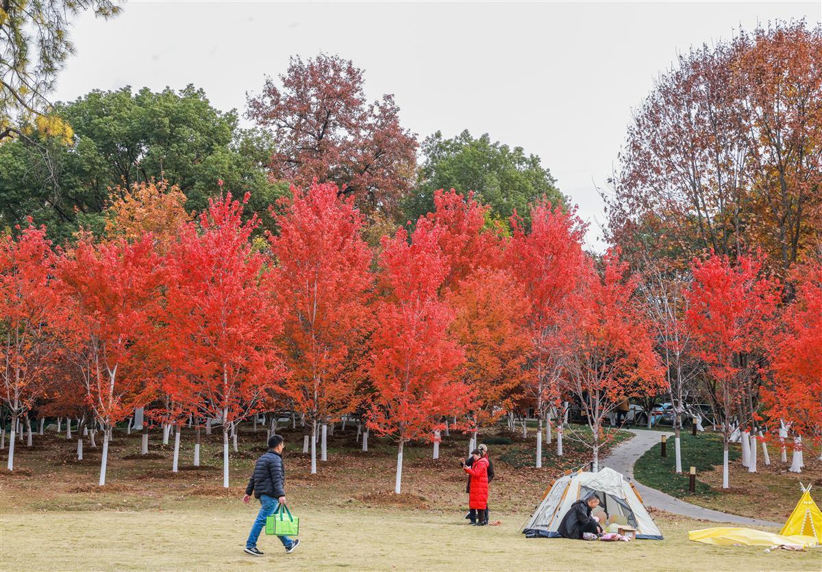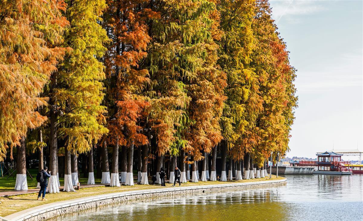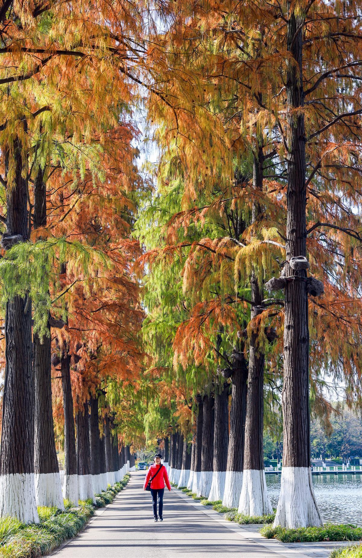 初冬的武汉一连数日晴空万里,东湖湖畔的红枫、银杏等树木五彩斑斓,从深红到金黄,从浅黄到艳红,各种色彩层层叠叠,相映成景。从空中俯瞰,东湖景区美成了一幅油彩画,让人顿生“舟行碧波上,人在画中游”的感觉。
