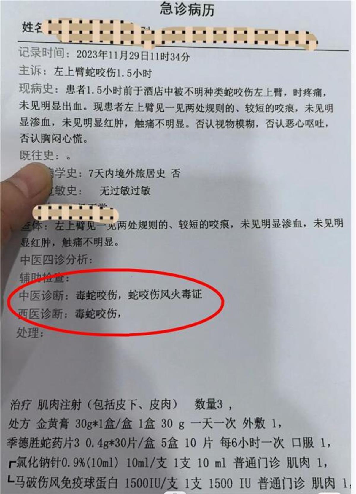 随后,她打电话给酒店前台,并在一名酒店实习生的陪同下,打车去医院处理,医生判断大概率是无毒蛇,但无毒蛇不代表没有毒素,因此给她打了破伤风针,还吃了10颗去蛇毒的药。据吴女士发布的医院急诊病历显示,医生查体左上臂见两处规则且较短的咬痕,未见明显渗血,未见明显红肿,触痛不明显,诊断为“毒蛇咬伤,蛇咬伤风火毒证”。