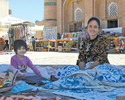 希瓦古城广场上的手工艺人扎米拉(右)和孩子。 |