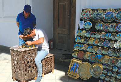 在布哈拉雅克城堡内,手工艺人正在制作极具当地特色的手工艺品。 |