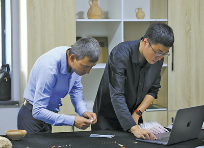 在撒马尔罕考古研究所里,中乌两国考古工作者正一起整理归档从乌兹别克斯坦苏尔汉河州拉巴特等遗址发掘的文物。自2017年至今,中乌联合考古队已在相关遗址发掘出镜子、簪、耳环、手镯等铜器,盆、钵、罐、壶等陶器,剑、带扣、刀等铁器,以及各种材质串珠、金箔饰片等古代月氏文化的遗存文物。