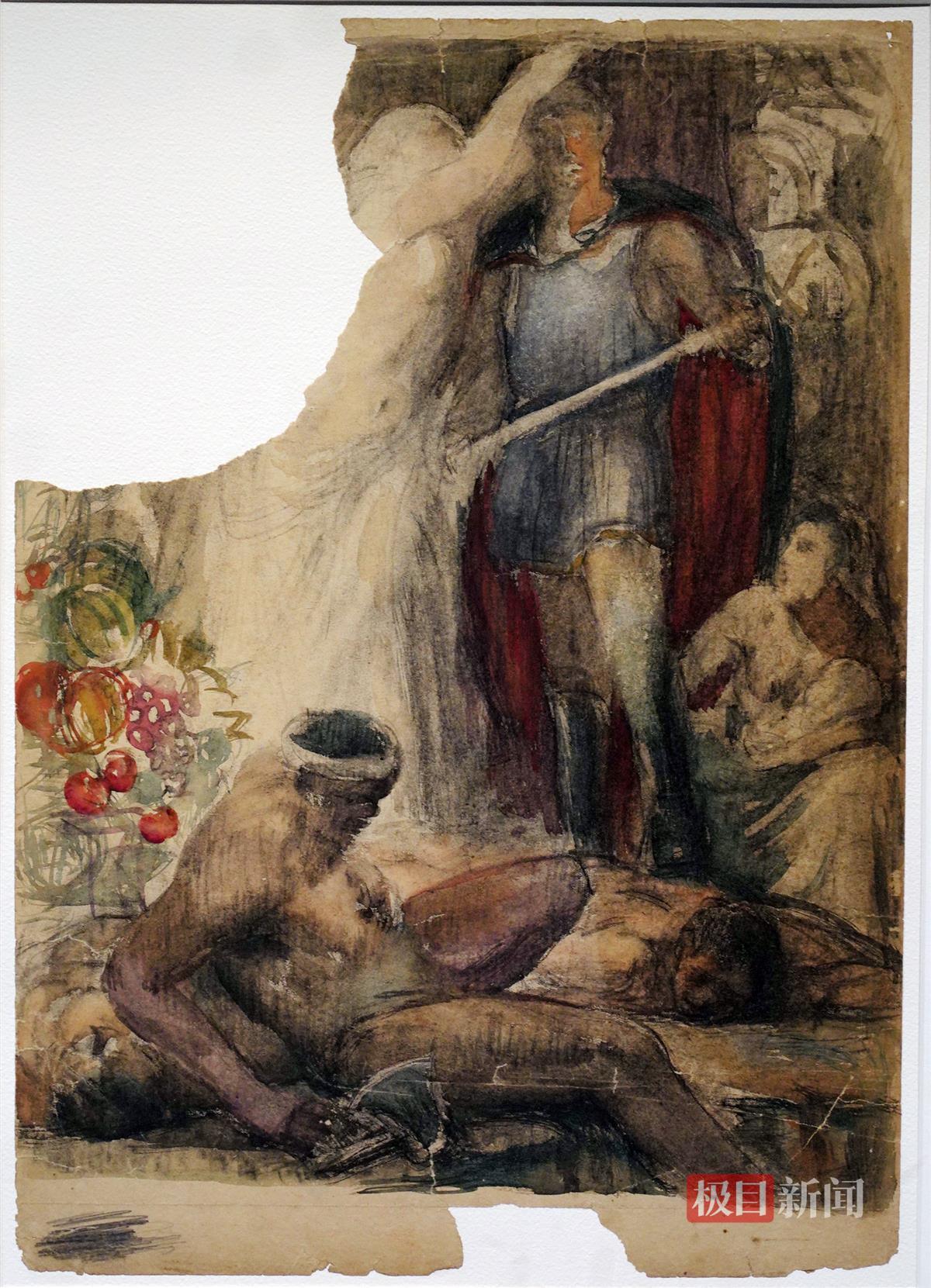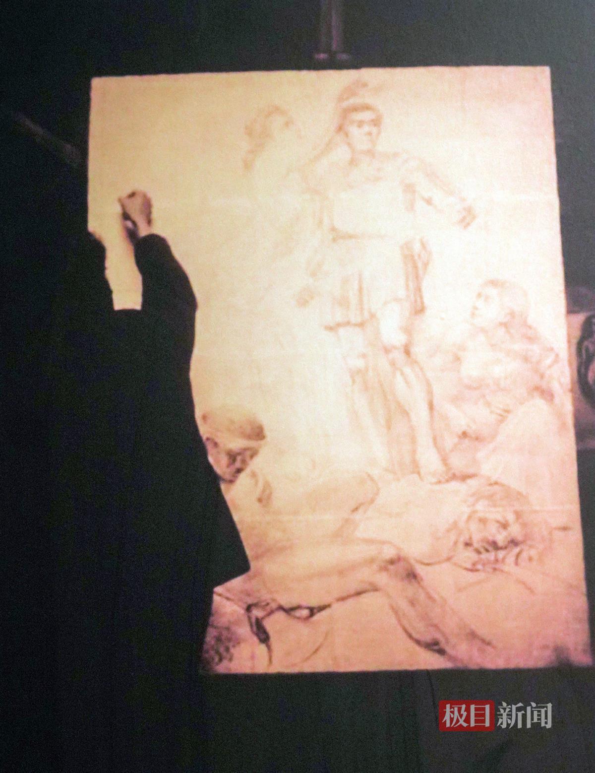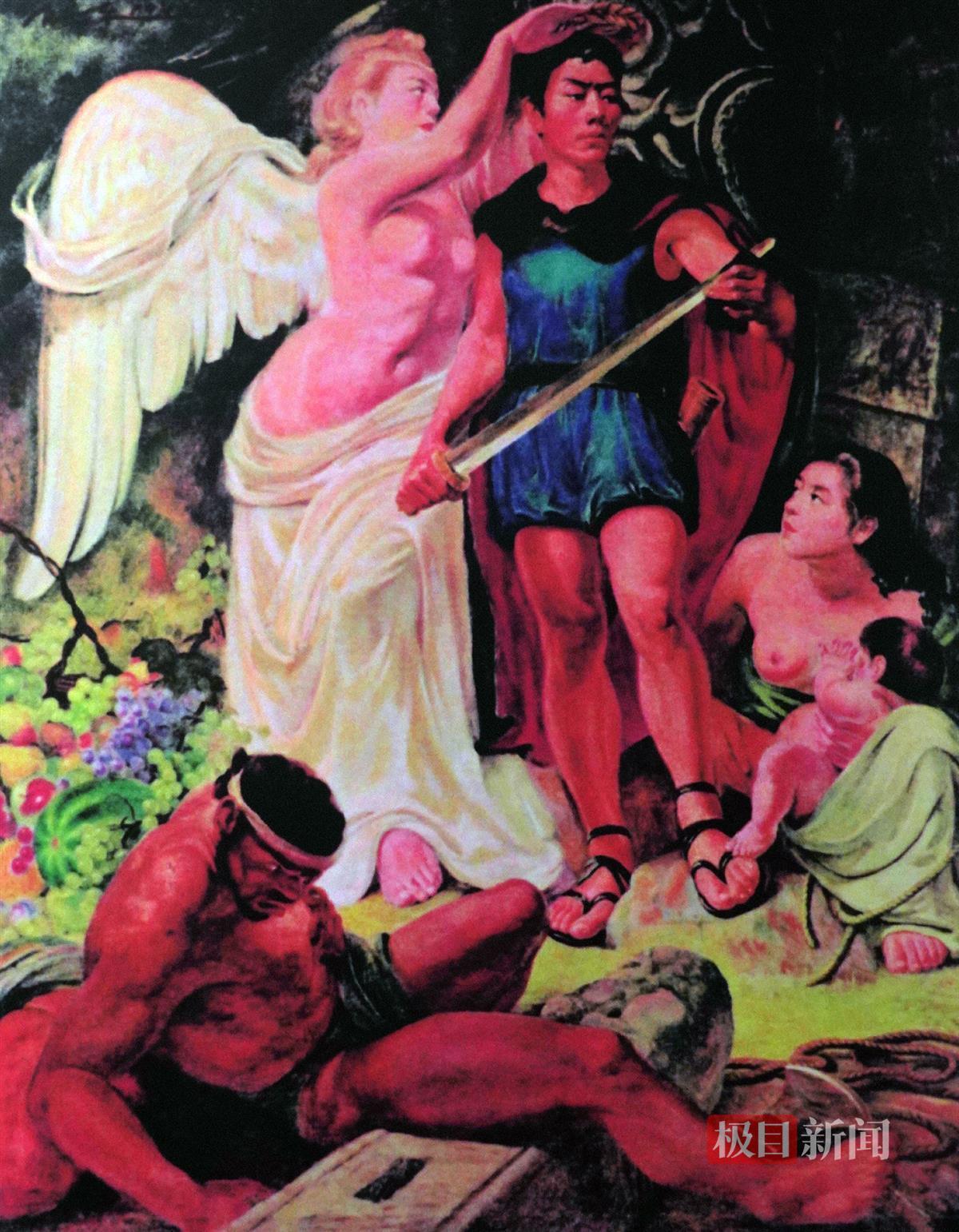 极目新闻记者看到,画面中,一位希腊神话中的女神正在为一名持剑的中国勇士戴上桂冠,勇士的右侧是受到他保护的妇女和儿童,左下方是被打败的敌人,一个匍匐倒地,一个手捂着腹部伤口。1942年,这件作品亮相当时的全国美展,便引起了美术界的关注。这是唐一禾借用18世纪至19世纪欧洲艺术家鲁本斯的油画《胜利女神为美德英雄加冕》,加以改造而创作,作品名字就叫《胜利与和平》,表达抗战一定会取得胜利,胜利女神为中国勇士加冕。