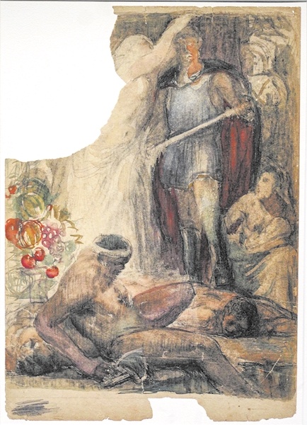 极目新闻记者看到,画面中,一位希腊神话中的女神正在为一名持剑的中国勇士戴上桂冠,勇士的右侧是受到他保护的妇女和儿童,左下方是被打败的敌人,一个匍匐倒地,一个手捂着腹部伤口。1942年,这件作品亮相当时的全国美展,便引起了美术界的关注。这是唐一禾借用16世纪至17世纪欧洲艺术家鲁本斯的油画《胜利女神为美德英雄加冕》,加以改造而创作,作品名字就叫《胜利与和平》,表达抗战一定会取得胜利,胜利女神为中国勇士加冕。