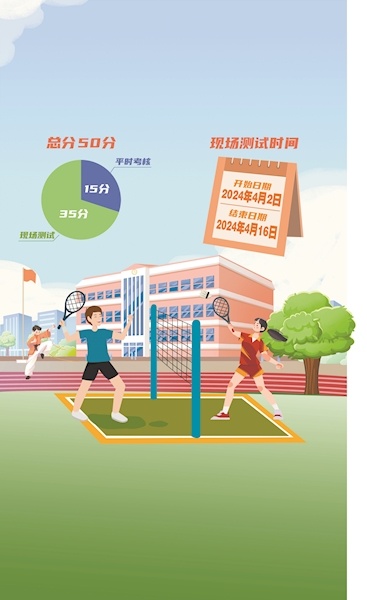 楚天都市报极目新闻讯(记者国倩)12月4日,武汉市教育局官网发布《2024年武汉市初中毕业升学体育与健康考试实施方案》,与往年相比,2024年武汉体育中考总分不变,平时考核为15分,现场测试为35分,共计50分。但选考项目有变化,增加了乒乓球、羽毛球、网球、武术、体操、游泳等。现场测试时间为2024年4月2日至16日。