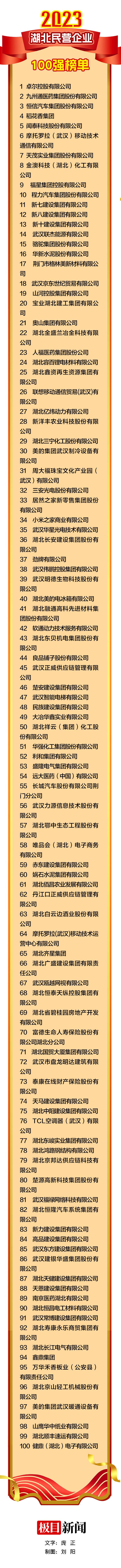 据介绍,此次榜单以企业2022年度营业收入总额为标准进行排序,卓尔控股有限公司、九州通医药集团股份有限公司、恒信汽车集团股份有限公司等100家民营企业入围“2023湖北民营企业100强”。稻花香集团、闻泰科技股份有限公司、摩托罗拉(武汉)移动技术通信有限公司等100家民营企业入围“2023湖北民营企业制造业100强”。卓尔控股有限公司、九州通医药集团股份有限公司、恒信汽车集团股份有限公司等20家民营企业入围“2023湖北民营企业服务业20强”。