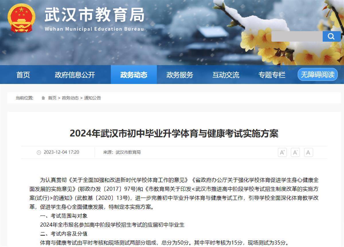 湖北日报讯 (记者张倩倩)12月4日,武汉市教育局官网发布2024年武汉市初中毕业升学体育与健康考试实施方案,进一步完善初中毕业升学体育与健康考试工作,引导学校全面深化体育教学改革,促进学生身心全面健康发展。