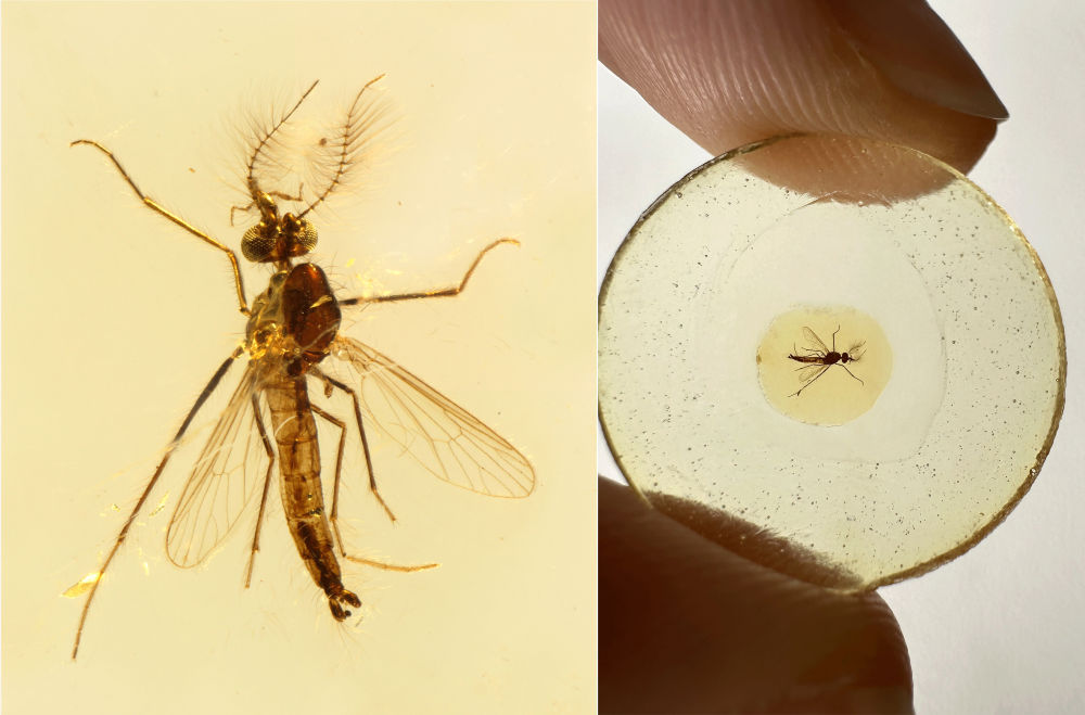 此次发现的雄蚊化石标本(左为琥珀中的远古蚊子标本,右为琥珀薄片)。(中国科学院南京地质古生物研究所供图)