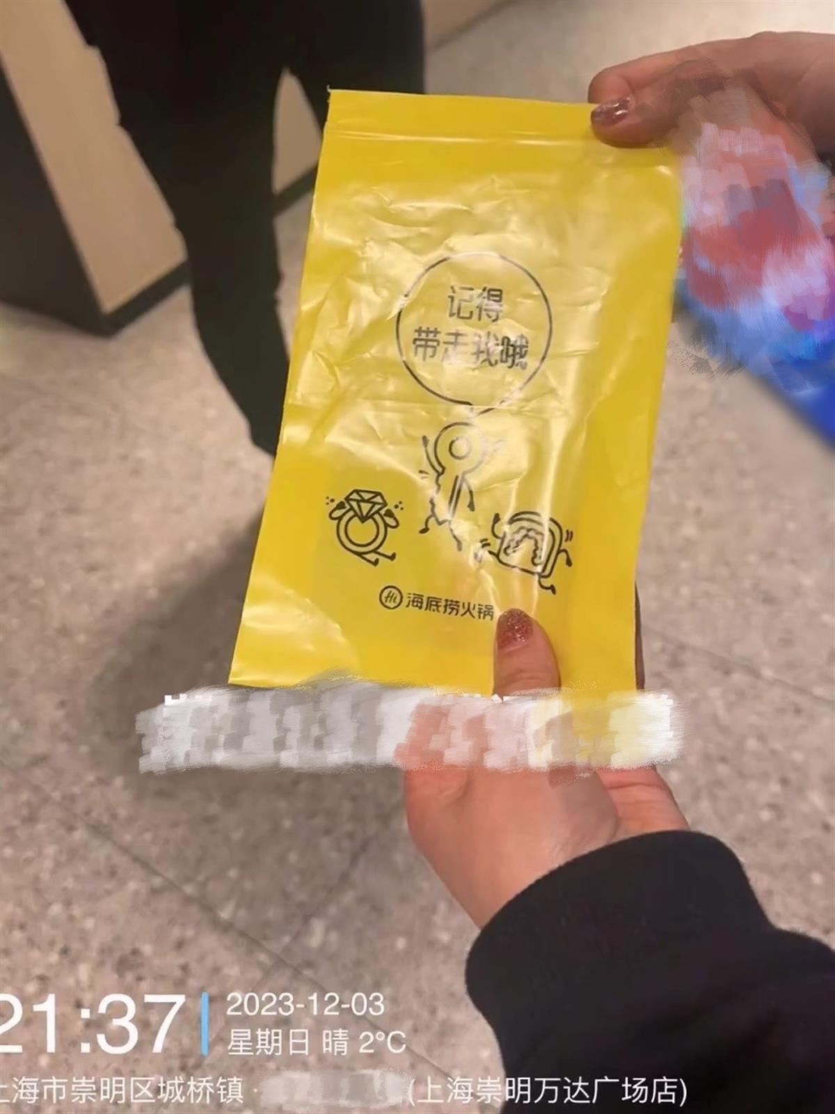 该女子质疑称,专用袋中有两枚钻戒,店员居然没有发现。其发布的视频显示,该专用袋外表是黄色,上面写着“记得带走我哦”,并印有海底捞的标识。
