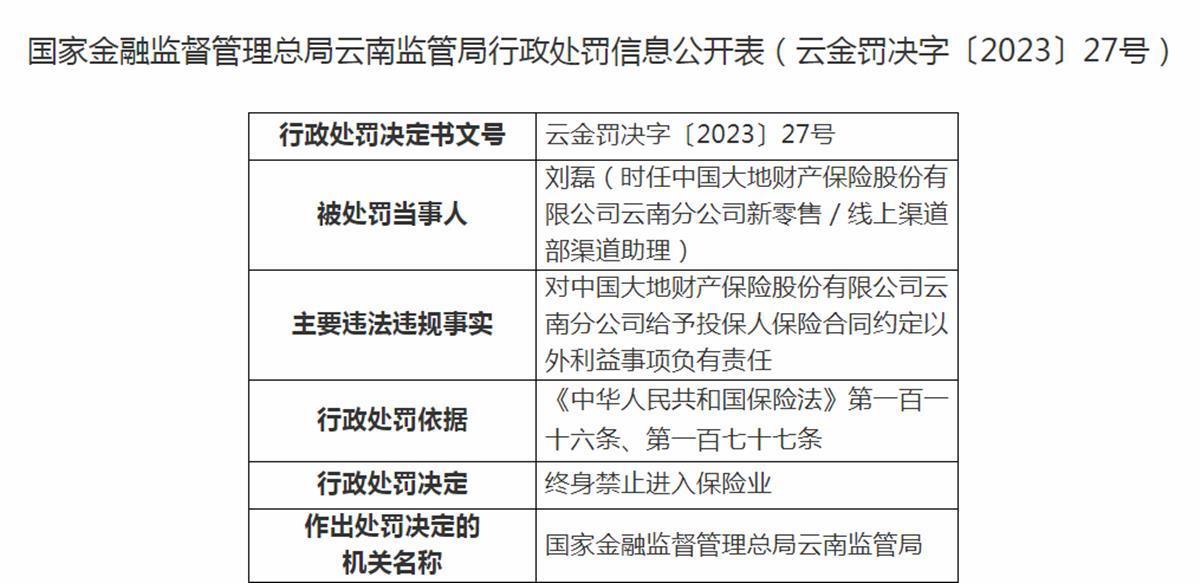 禁止进入保险业的“名单”人员又有增加,近日,国家金融监督管理总局官网发布信息,时任中国大地财产保险股份有限公司(简称“大地财险”)云南分公司新零售/线上渠道部渠道助理刘磊,因为对大地财险云南分公司给予投保人保险合同约定以外利益事项负有责任,被终身禁止进入保险业。