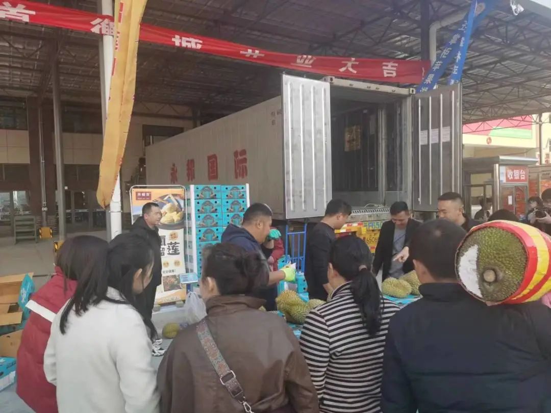 运营第七天,下午四点,首衡城水果区内,虽不似开业那天人潮汹涌,但临近下午闭市时分,还有不少人车穿行。正对进口水果区大门的小宝哥农产品销售档口,聚集了不少顾客,他们正在挑选榴莲,“泰国金枕榴莲38元一斤,大果已经卖完了,现在这些小的零售批发价,也非常好吃……”档口里面的两车厢空空如也,两柜榴莲销售一空。