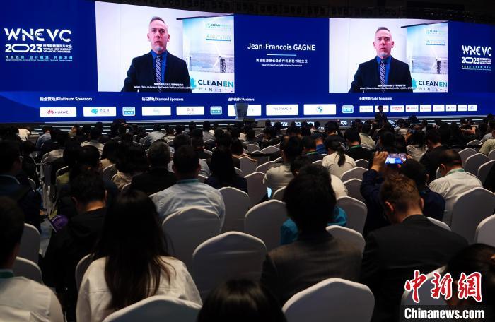 2023世界新能源汽车大会上,清洁能源部长级合作机制秘书处主任Jean-Francois GAGNE视频致辞。中新网记者 孙自法 摄