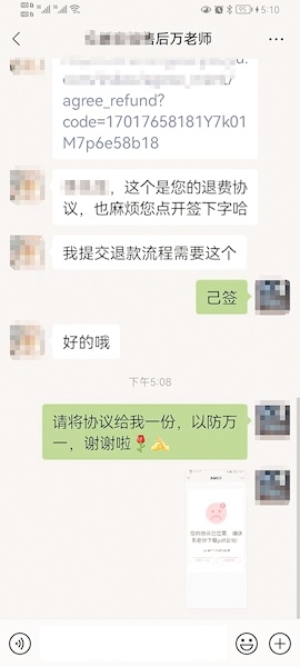 “我看过合同后觉得不合适,就没有在电子合同上签字,提出退款。经过多次催促,对方才答复我说可以退款,但需要扣除几百元的开班信息费,我压根就没上过一分钟的课,怎么就开班了?”王先生不解地说。