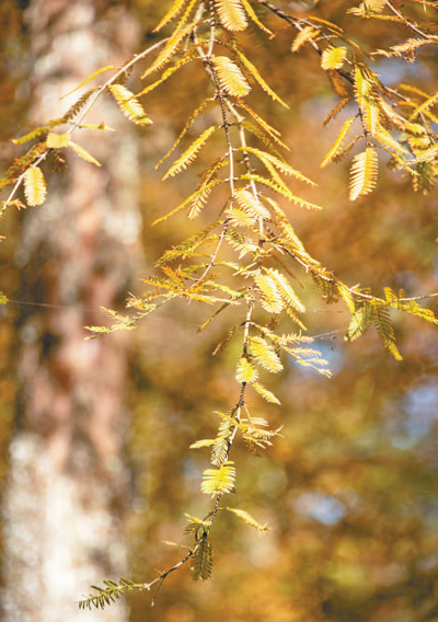 水杉,系杉科水杉属,乔木,树干成熟后可高达30米,树皮为灰褐色,会成条状剥落。水杉叶如羽毛状,春季翠绿,夏季青绿,秋季渐渐转变为黄色。